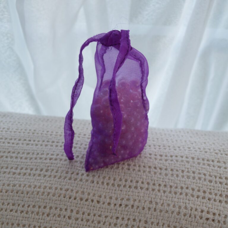 This is a small sheer drawstring bag that I sewed by hand. It isn’t perfect, but the sheer fabric is hard to wrangle, so I consider it a personal accomplishment.