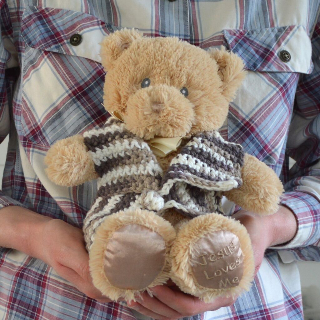 This is a teddy bear vest that I crocheted using a H/8 hook and 100% cotton yarn.